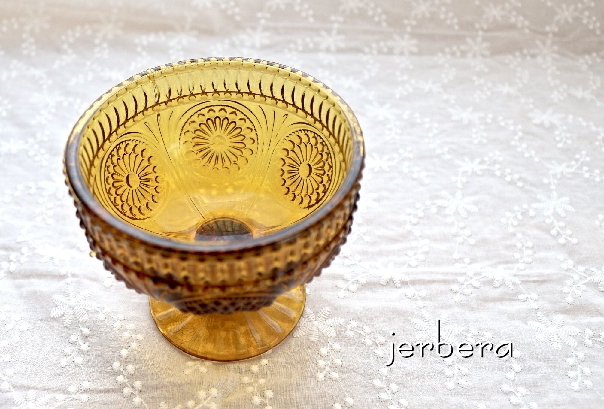 ◇表面に花のレース模様が刻まれた、アンティーク風のデザートグラス。